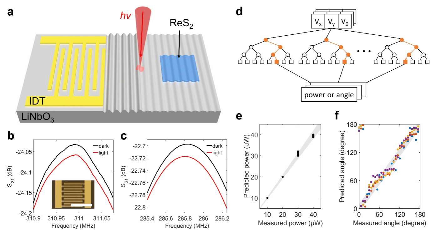 图 1. 光热-声电机理和基于此效应的多维度光电探测。a,光热-声电效应的机理示意图。b,实验测量得到的,不同光照条件下叉指换能器传输参数的对比。插图为叉指换能器的光学图像。标尺代表200微米。c,有限元仿真得到的,不同条件下叉指换能器传输参数的对比。d,随机森林算法示意图。e,训练后算法对功率的预测结果。灰色区域代表实验误差。f,训练后算法对偏振角度的预测结果。数据点颜色代表所属功率。灰色区域代表实验误差。